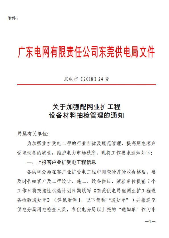 東莞電行〔2018〕23號--轉發東莞供電局《關于加強配網業擴工程設備材料抽檢管理的通知》