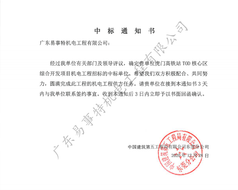 近日,易事特機電成功中標虎門高鐵站TOD核心區(qū)綜合開發(fā)項目機電工程,本項目位于東莞虎門鎮(zhèn),項目占地約560畝,總投資為240億元,建設(shè)規(guī)模為135萬平方米,總工期486天。