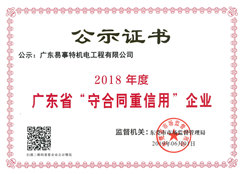 2019年6月1日,廣東易事特機(jī)電工程有限公司被東莞市市場(chǎng)監(jiān)督管理局授予 “2018年度廣東省重合同守信用企業(yè)”榮譽(yù)稱(chēng)號(hào),預(yù)示著易事特機(jī)電在走向市場(chǎng)經(jīng)濟(jì)規(guī)范化,提高企業(yè)守法經(jīng)營(yíng)能力,塑造企業(yè)良好信譽(yù)形象又邁上了一個(gè)新臺(tái)階。